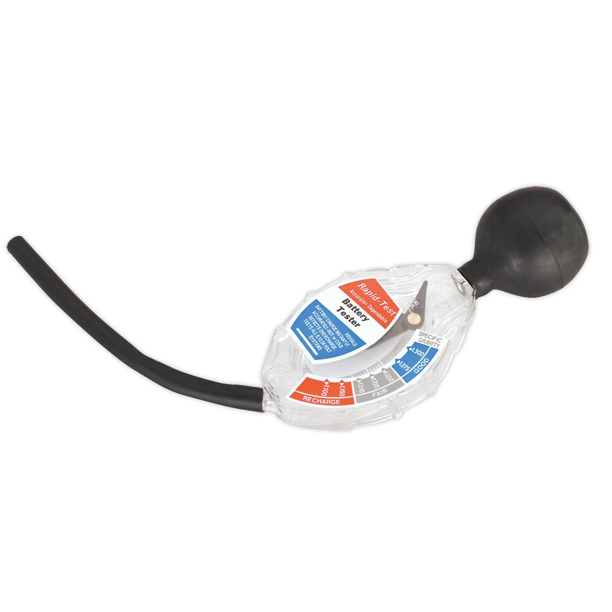 Tests 6, 12 and 24V batteries. Composite body and rubber bulb for workshop durability.