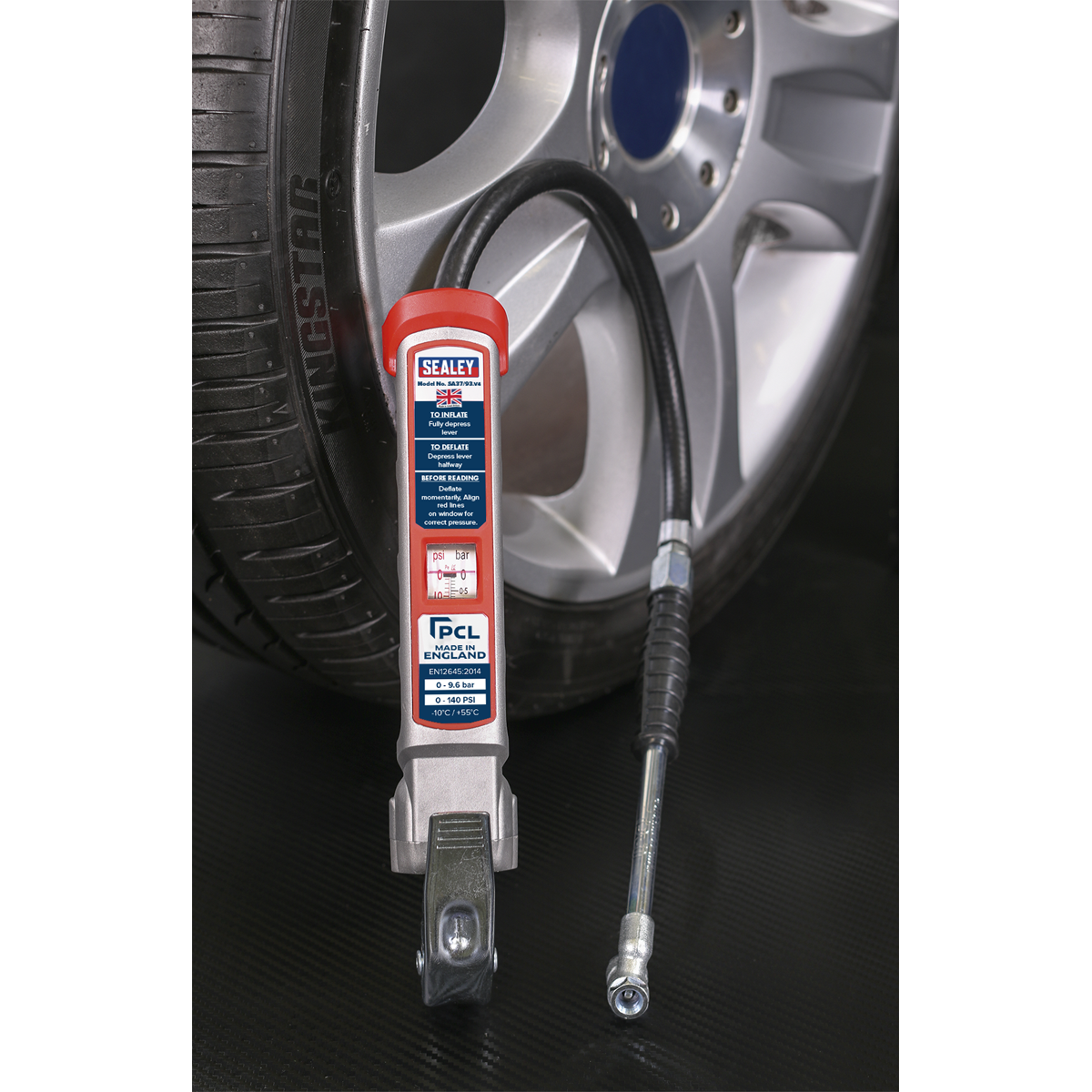 Manufactured to comply with EN 12645. Aluminium body with rubber bumper. Linear pressure scale, dual calibrated in psi and bar, with parallax correction. 0.5m flexible hose fitted with 240mm twin push-on air connector. Supplied with a serial numbered calibration certificate.