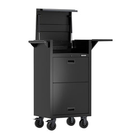 The BUNKER® diagnostic trolley is made of steel and features a durable, industrial powder coated finish, making it perfect for busy workshops. It includes a top compartment with a lift-up lid that opens smoothly, supported by gas struts. Inside, there is a grommet for power access, a 3-way UK power strip with three USB ports, complete with a magnetic holder. The lockable front doors slide open to reveal a versatile arrangement of five drawers. There is thick EVA foam lining the top compartment and all drawers to protect tools and equipment. Additionally, there is a collapsible side table for laptop use. The trolley is designed for easy mobility around the workshop, featuring a side handle and sturdy castors, with two of the castors equipped with brakes.
