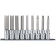 Expert Quality, 9 socket fitted with insert bits. All socket manufactured from hardened and tempered chrome vanadium steel with sand blasted bits of S2 silicon steel. Each socket has a knurled ring for extra grip. Supplied on a steel socket retaining rail.