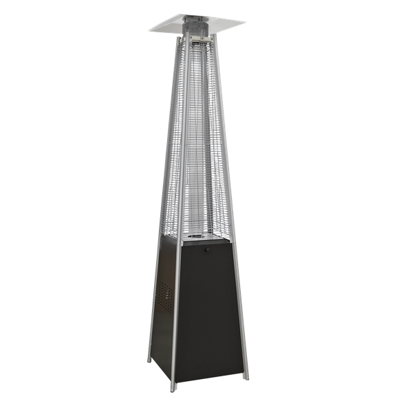 Innovative design of Gas Flame Pyramid Patio Heater. This contemporary freestanding patio heater produces a pleasant, heated working /relaxing environment and is ideal for both commercial and domestic settings including open workshops, boat yards, patios, forecourts, gardens and terraces. Standing at 2.27m tall, when lit the heater produces a real flame encompassed by a glass tube which heats the surrounding area, a metal reflector makes sure heat is directed downwards and outwards. Variable heat output controls make it fully adjustable and the unit features a fully enclosed gas cylinder chamber and safety tip-over switch. Available in black or stainless steel and is supplied with regulator and hose assembly for use with propane patio gas bottles. This product should only be used in a well ventilated area. Batteries not included.