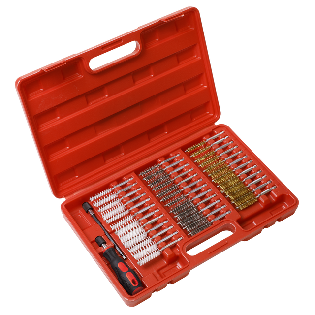Ideal for cleaning and decarbonising areas with limited access, especially injector apertures before refitting. Set includes brass, steel and nylon brushes Ø8-19mm, Soft grip handle and one-piece 150mm extension. Supplied in storage case.