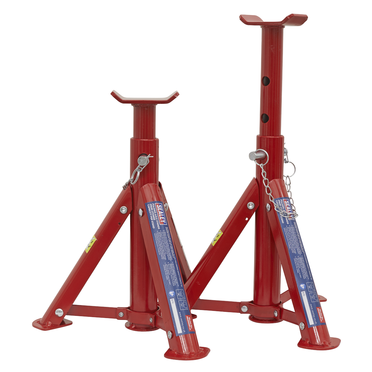 Folding design saves space and makes these axle stands ideal for occasional use. Welded steel construction for increased strength and safety. Folding design for space efficient storage. Fitted with double-locking safety pin. Sold in pairs.