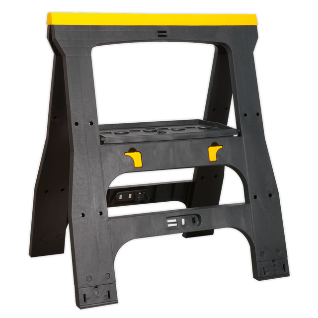 Manufactured from 30mm thick heavy-duty composite material, with ribbed rubber feet for added stability. Ideal for supporting large workpieces when cutting, drilling and sawing. Rubber ring anti-slip grips for added workpiece stability. Four composite hooks, two either side, allow for work material to be positioned to enable quick and easy-access. Fully collapsible for easy storage and transportation.