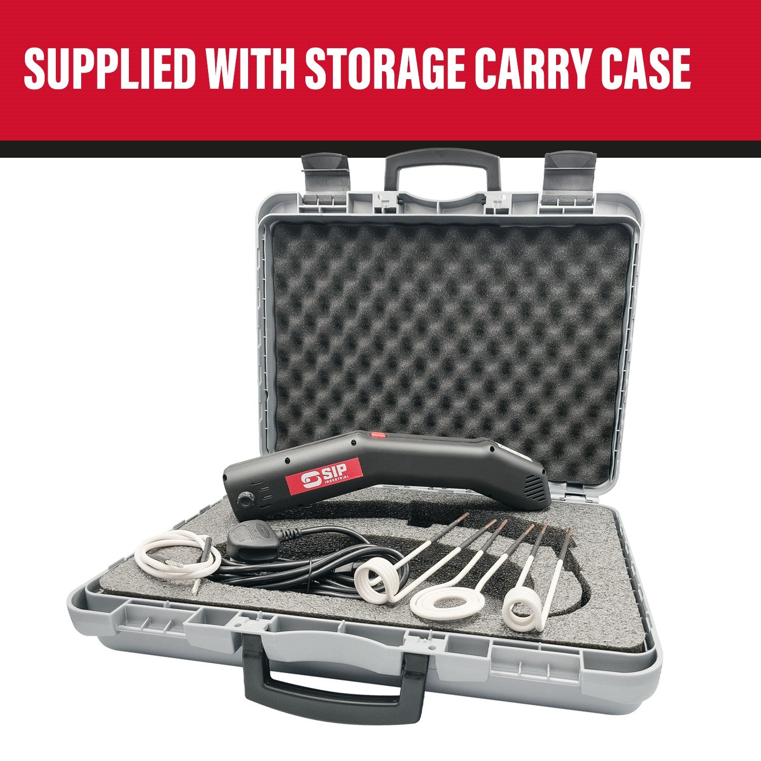 A blow-moulded carry case allows for easy storage of the handheld unit and 4x induction heater coils between uses.