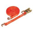 Manufactured from polyester webbing with stitched reinforcement around hooks. Suitable for securing loads and tarpaulins onto flat-beds or trailers and for general load restraint. Ratchet mechanically tensions the webbing using a simple drum and ratchet mechanism providing superior load restraint.
