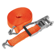 Manufactured from polyester webbing with stitched reinforcement around hooks. Suitable for securing loads and tarpaulins onto flat-beds or trailers and for general load restraint. Ratchet mechanically tensions the webbing using a simple drum and ratchet mechanism providing superior load restraint.