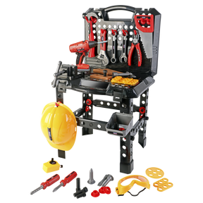 | Contents: | Workbench, Screwdriver (x2), Adjustable Wrench, Pliers, Hammer, Saw, Electric Drill with Assorted Drill Bits, Spanner (x2), Nuts (x20), Bolts (x20), Pre-drilled Blocks (x3), Pre-Drilled Shapes (x6), Hooks (x10), Hat, Goggles, Double-Sided Tape Measure, Tray, T-Wrench, Plugs (x2), Vice. |