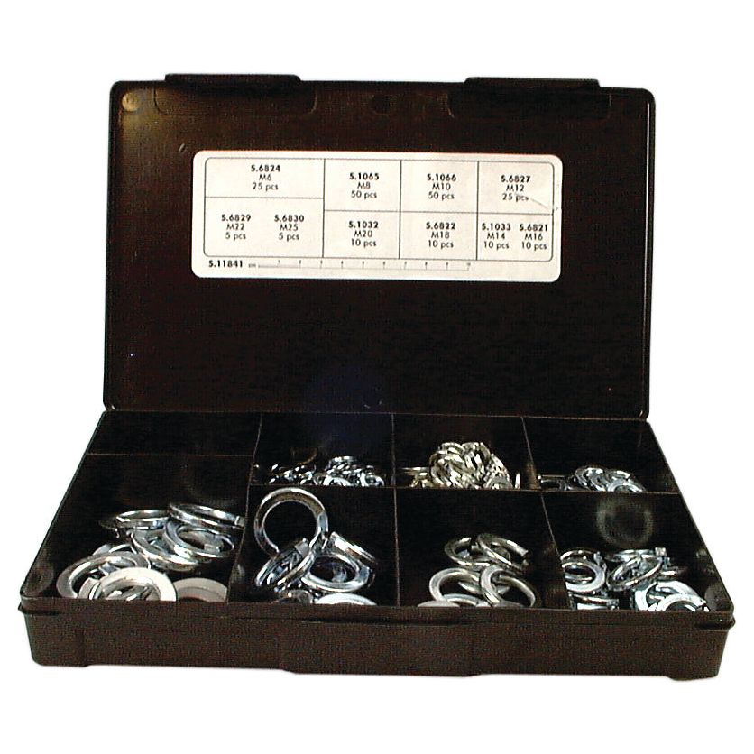 Contains: 25 x S.6824 Metric Spring Washer, ID: 6mm (Din 127A) 50 x S.1065 Imperial Spring Washer, ID: 5/16'' (Din 127B) 50 x S.1066 Imperial Spring Washer, ID: 3/8'' (Din 127B) 25 x S.6827 Metric Spring Washer, ID: 12mm (Din 127A) 10 x S.6821 Metric Spring Washer, ID: 14mm (Din 127A) 10 x S.1033 Imperial Spring Washer, ID: 5/8'' (Din 127B) 10 x S.6822 Metric Spring Washer, ID: 18mm (Din 127A) 10 x S.1032 Imperial Spring Washer, ID: 3/4'' (Din 127B) 5 x S.1034 Imperial Spring Washer, ID: 7/8'' (Din 127B) 5 x S.6830 Metric Spring Washer, ID: 24mm (Din 127A)