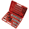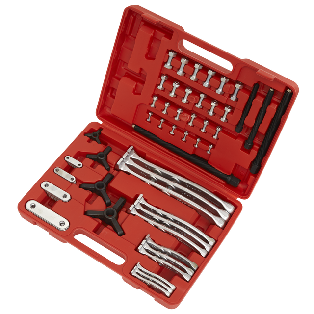 Drop-forged, Chrome Vanadium steel reversible legs. Swivel thrust plates on larger sizes prevent damage to shaft ends. Hex head forcing screws suitable for use with a ratchet or spanner. Supplied in a storage case.