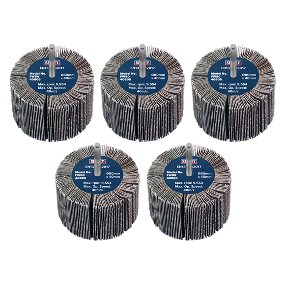 Sealey | 80 x 40mm Abrasive Flap Wheel on 6mm Shaft 80Grit - Pack of 5 - FW8040805 0.98 kg