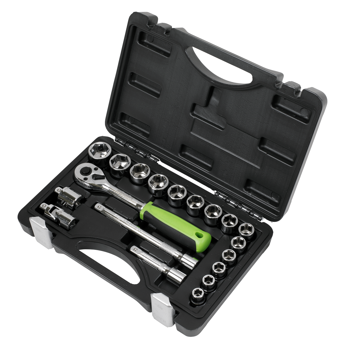 Professional socket set manufactured from hardened and heat treated Chrome Vanadium steel. Fully polished with a mirror finish. Covers sizes from 8 to 22mm. Includes 72-tooth comfort grip ratchet wrench, extension bars, universal joint and adaptor. Supplied in tough, durable storage case.