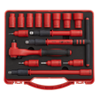 Hardened and tempered Chrome Vanadium steel sockets and accessories. Chrome plated for resistance to corrosion. Each component is fully insulated to VDE and EN 60900 standards to protect from electric shocks up to 1500V DC and 1000V AC. Ideal for technicians working on modern hybrid and electrical vehicles (1500V DC safe live working). Also suitable for electricians and other trades (1000V AC safe live working). Supplied in storage case.