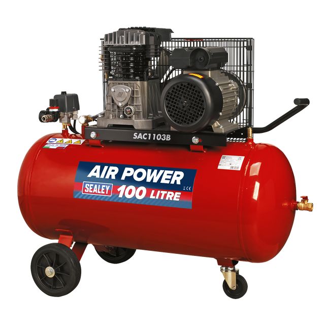 Air Compressor 100L Belt Drive 3hp with Cast Cylinders & Wheels - SAC1103B 90.0 kg