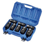 These Draper HI-TORQ® 6-point deep impact sockets are forged from hardened chrome molybdenum. Black phosphate finish for corrosion protection. Includes sizes 24, 27, 30, 32, 33, 36, 41, 46mm. For use with electric or pneumatic impact wrenches with a 3/4" drive. Ring and pin installed. Supplied inside a sturdy plastic storage case with metal hinges and buckle.