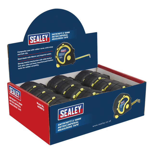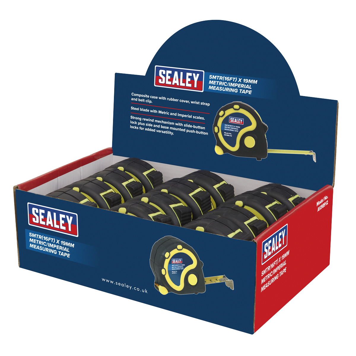 Rubber Tape Measure 5m(16ft) x 19mm Metric/Imperial Display Box of 12 - AK98912 2.324 kg