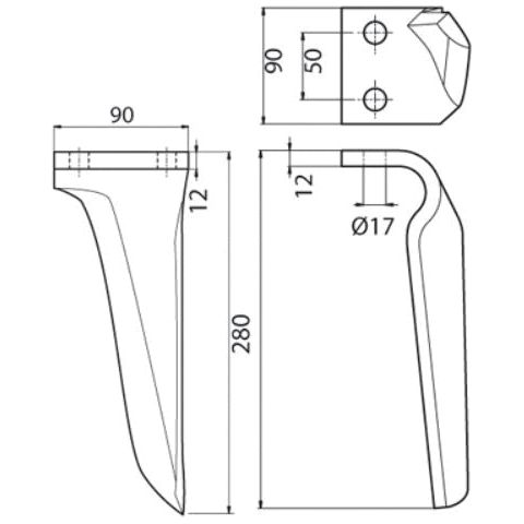 Power Harrow Blade 90x12x280mm LH. Hole centres: 50mm. Hole Ø 17mm. Replacement for Kverneland, Maschio. To fit as: 27100210