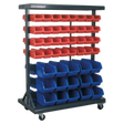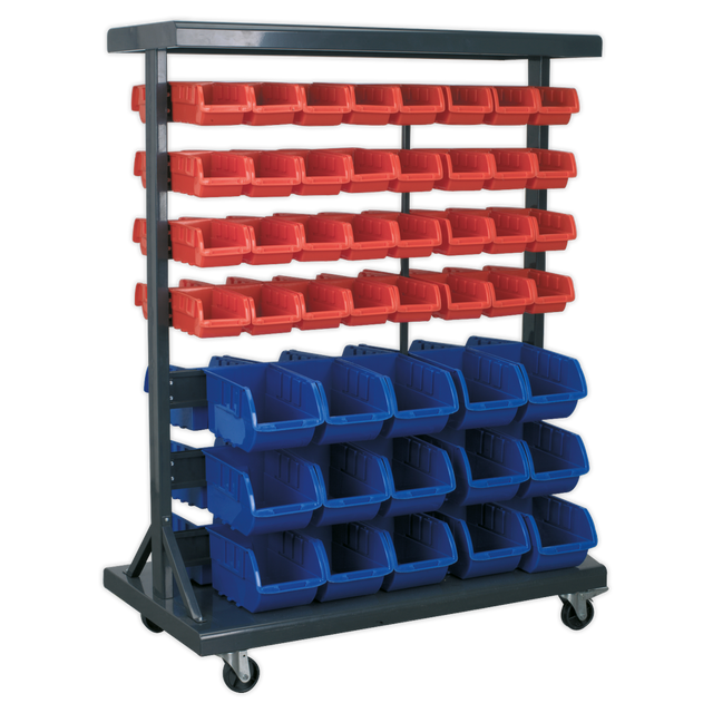 Powder coated steel racking with composite storage bins positioned evenly on both sides. Mounted on heavy-duty castors (two lockable) for mobility.