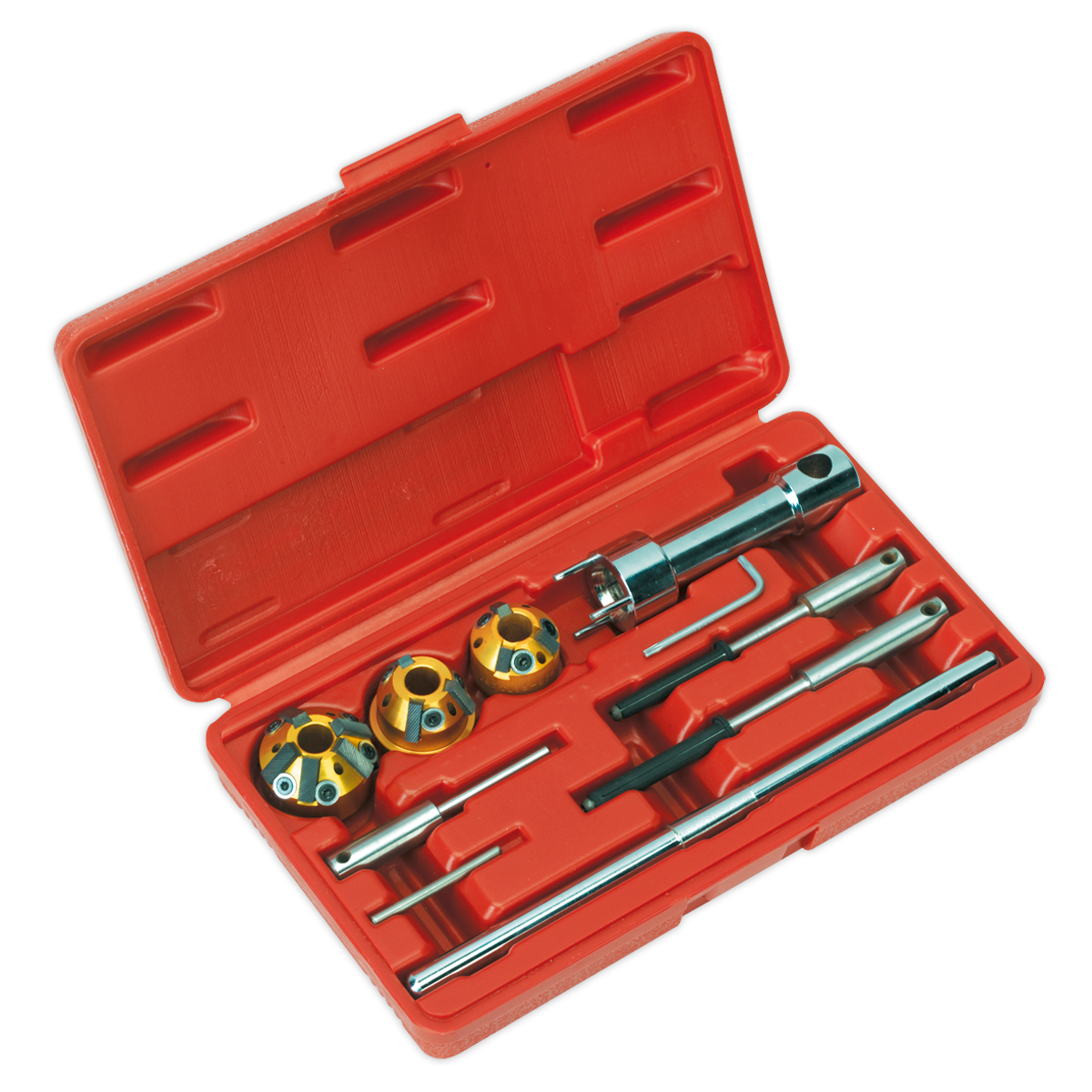 Suitable for re-cutting inlet/exhaust valve seats concentric to the valve guides. Features tungsten carbide cutting blades, expandable pilots and double end cutters for increased application. Supplied in storage case.
