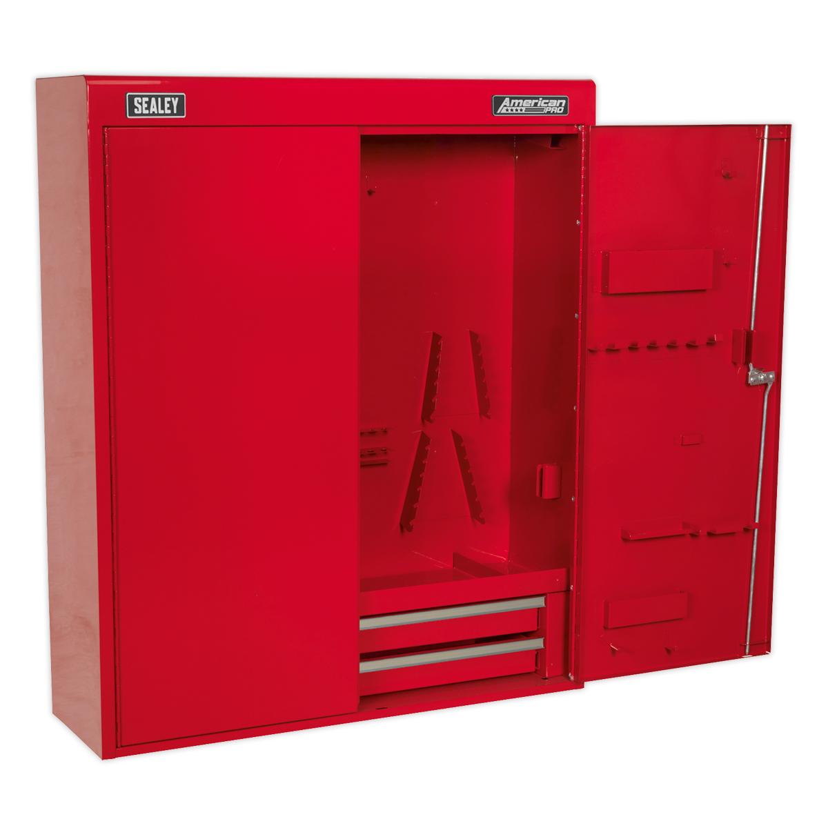 Wall cabinet manufactured from heavy gauge steel with enamelled powder coated finish. Two piano hinged lockable doors. Inside are assorted hooks to help organise tools and two full width slide drawers.