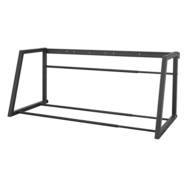 Wall or floor mounting tyre rack helps keep work area tidy. Steel construction with a powder coated finish giving corrosion resistance. Adjustable width to suit space available. Holds up to 90kg when wall mounted.