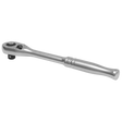 Chrome Vanadium steel gear-to-gear 90-tooth ratchet wrench. Hardened and tempered with a micro satin finish. Slim style contoured handle with pear-head design. Features flip reverse and quick release mechanism.