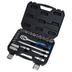This socket set is made from chrome vanadium steel with a satin chrome finish. It includes a wide range of 1/2" Sq. Dr. 6-point HI-TORQ® sockets in sizes 8-24mm. The 72-tooth quick release ratchet is equipped with a soft grip handle for comfort. The set includes extension bars (75, 125, 250mm), spark plug sockets (16, 21mm) and a universal joint. All of these items are supplied inside a sturdy plastic storage case.
