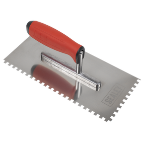 Designed for applying and spreading tile adhesives, hardwood floor applications and tile thinset mortar. A notched tile trowel also acts as a metered dispensing system, delivering just the right amount of mortar for the tile. Different sized notches will deliver the desired amount of adhesive for the job in hand. Rubber soft grip, ergonomic two-component handle for prolonged periods of work in comfort. Stainless steel, high quality, highly durable and rust resistant. Precision made blade. Well balanced and flexible. Aluminium foot for lightweight strength and durability. Ideal for brickwork and plasterwork with mortar, putty, plaster, and adhesives. Part of the Sealey wide range of trowels, floats and building equipment.