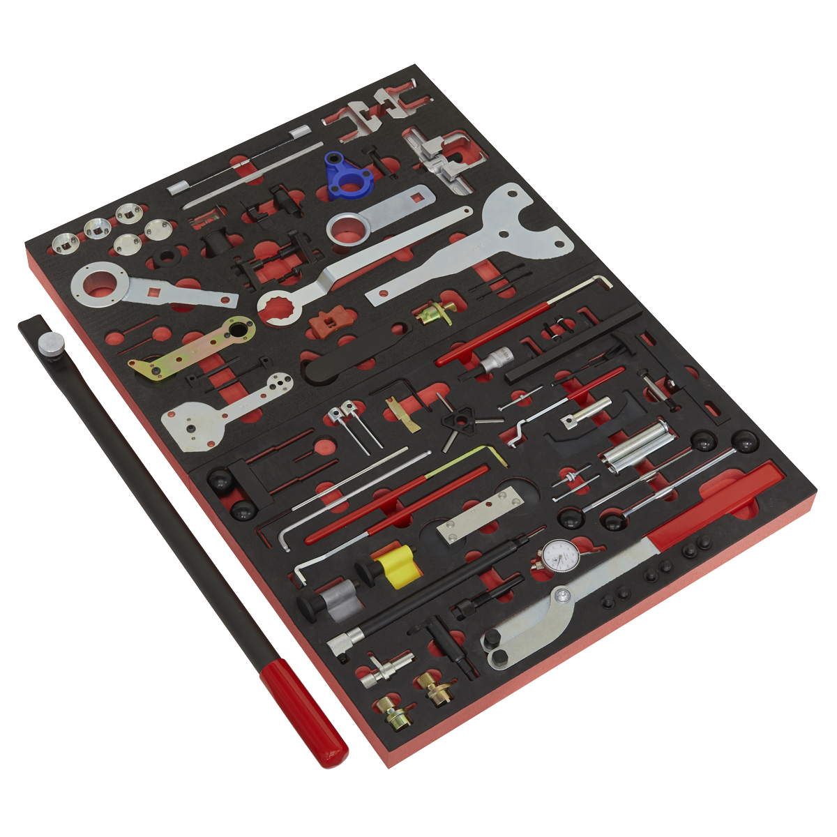 Master timing tool kit for VAG vehicles. Covers a wide range of petrol and diesel engines. Suitable for popular VAG vehicles from 1995 to present. Applications include Gen III petrol engines featuring single or twin variable valve timing. Supplied in two high quality storage foams suitable for toolbox drawers. Foam size: 560 x 390 x 45mm.