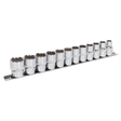 Cold-forged Chrome Vanadium steel 12-point sockets, hardened and tempered for added strength. Fully polished chrome finish for corrosion resistance. WallDrive® configuration giving an additional 30% more torque handling power than traditional sockets. Knurled ring for extra grip with oily fingers. Supplied with socket rail.