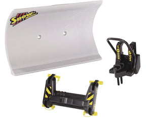 Crafted from durable plastic with a steel rail for added strength, the shield features a separate lifting device that fits seamlessly onto the front coupling or loader. It can be pivoted in three different positions, offering versatility for varying snow-clearing angles. The snow shield is delivered with two adapters for easy installation and adaptability.