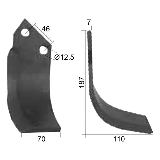 Rotavator Blade Curved RH 70x7mm Height: 187mm. Hole centres: 46mm. Hole Ø: 12.5mm. Replacement for Sovema To fit as: 900111001 | Sparex Part No.S.74750 0.78 kg
