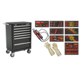 - Includes a robust 7 Drawer Rollcab with ball-bearing slides for smooth operation and easy access to tools, finished in sleek black for a professional look.