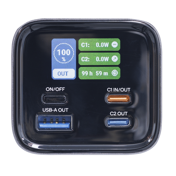 • SMART DISPLAY – Easy to read colour display shows current battery level, individual USB output usage, predicted charge time and other data.