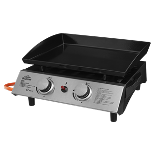 Gas plancha with two stainless steel burners. Piezo ignition ensures a safe and easy start-up every time. 3.5mm high quality steel cooking plate with an enamel coating. Supplied with regulator and hose assembly for use with propane patio gas bottles.