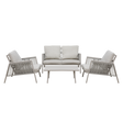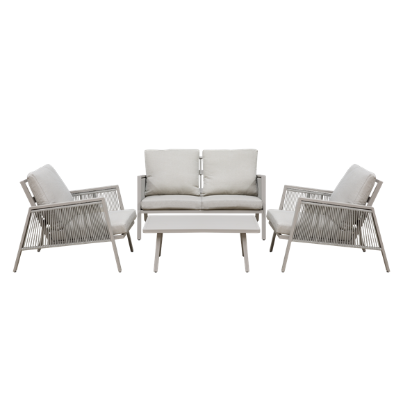 Manufactured using powder coated rustproof aluminium. Contemporary design with 8mm round weatherproof Textilene® rope. Supplied with 8cm thick seat and back cushions. Set includes 2-seater sofa, 2 x armchair and aluminium table. Some simple assembly is required. Disclaimer: Colours may slightly vary due to lighting conditions.
