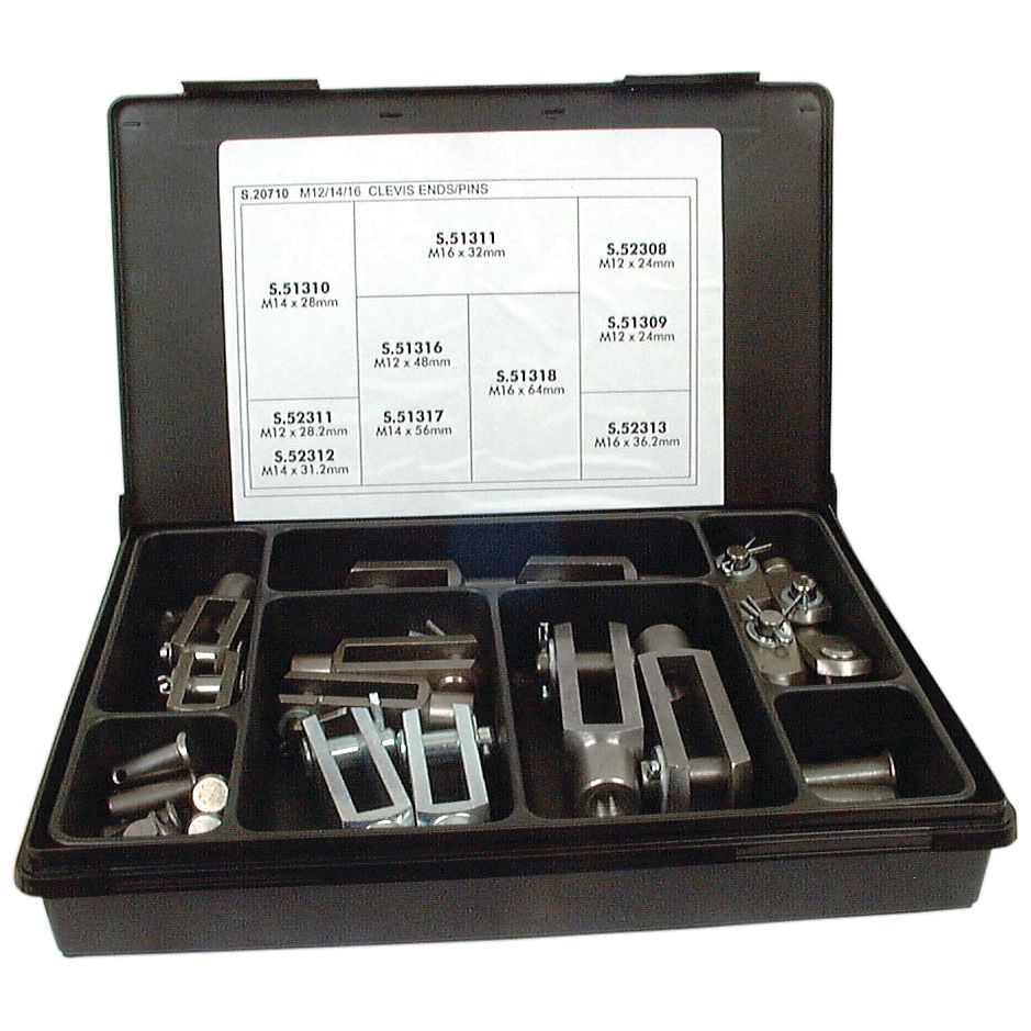 - **Comprehensive Metric Clevis End and Pin Assortment:** Includes a variety of clevis ends and pins, designed to accommodate sizes ranging from M12 to M16.