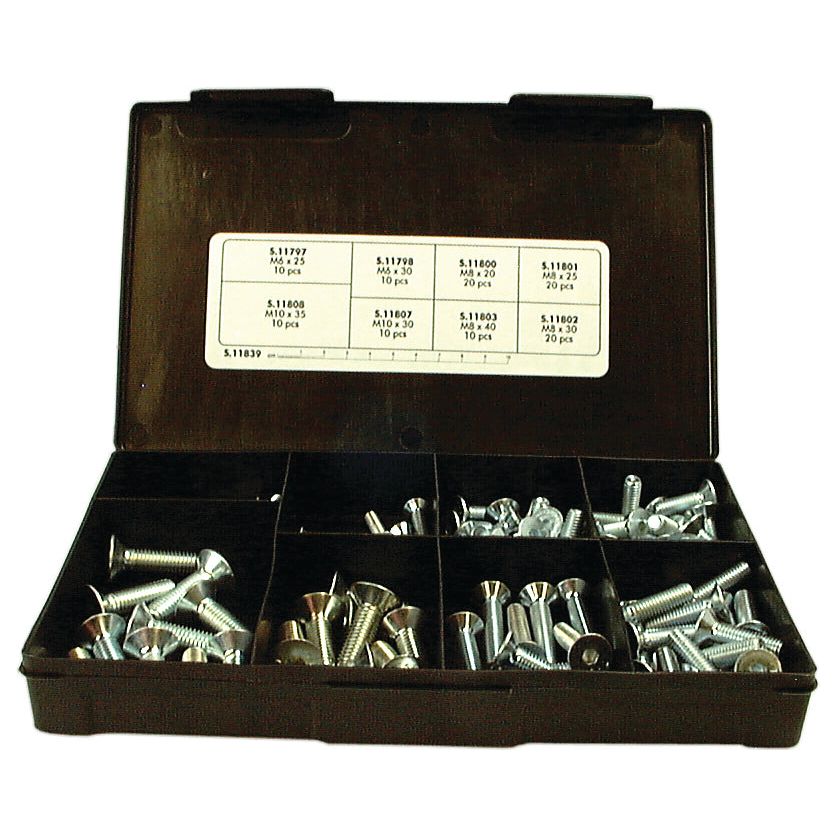 Contains: 10 x S.11797 Metric Countersunk Hexagon Socket Screw, Size: M6 x 25mm (Din 7991) 10 x S.11798 Metric Countersunk Hexagon Socket Screw, Size: M6 x 30mm (Din 7991) 20 x S.11800 Metric Countersunk Hexagon Socket Screw, Size: M8 x 20mm (Din 7991) 20 x S.11801 Metric Countersunk Hexagon Socket Screw, Size: M8 x 25mm (Din 7991) 20 x S.11802 Metric Countersunk Hexagon Socket Screw, Size: M8 x 30mm (Din 7991) 10 x S.11803 Metric Countersunk Hexagon Socket Screw, Size: M8 x 40mm (Din 7991) 10 x S.11807 Metric Countersunk Hexagon Socket Screw, Size: M10 x 30mm (Din 7991) 10 x S.11808 Metric Countersunk Hexagon Socket Screw, Size: M10 x 35mm (Din 7991)
