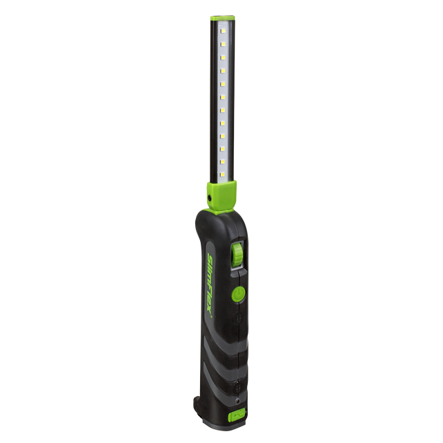 Slimline foldout inspection light for use in confined spaces, with 6mm minimum thickness. Inspection arm can be rotated 180° and folded back for use as a hands-free inspection light. Features 5W SMD LED which produce up to 500 lumens, operated by a rolling dimmer switch, and a 1W SMD LED in the end for use as a directional torch. Suitable for hands-free operation with three magnets and a hanging hook. Folds away, small and compact, suitable for keeping in your pocket. Can be charged in a SEALEY docking station - LED1801K (not included). Powered by a 3.7V 2.6Ah rechargeable lithium-ion battery which lasts up to 8hr. Supplied with USB charging lead.