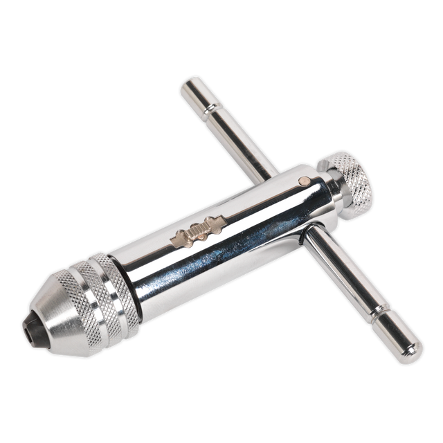 Manufactured from hardened steel with plated finish, full ratchet facility with forward, reverse and locking action with multi-positional sliding T-bar. Ideal for use in confined spaces. An enhancing addition to any tap and die set.