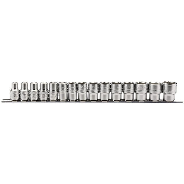 - Conveniently supplied on a metal socket rail, promoting organized storage and easy access to all 15 pieces.