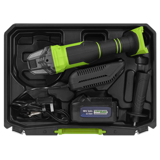 • Ø115mm Cordless angle grinder supplied with 18V 3Ah ithium-ion battery and a 2.4A mains charger in a storage case.