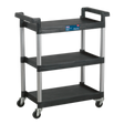 Composite garage workshop trolley with a 30kg capacity per shelf. Retention lips on only three sides of shelf allow easy-access when adding or removing items to and from trolley. Four large castors, two locking. Can also be used as a janitorial trolley.