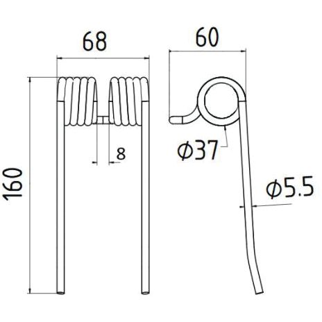 Pick-Up Tine Length:160mm, Width:68mm, Ø5.5mm - Replacement for Pottinger, Landsberg To fit as: 436144 | Sparex Part No.S.22885 is backordered and will ship as soon as it is back in stock.