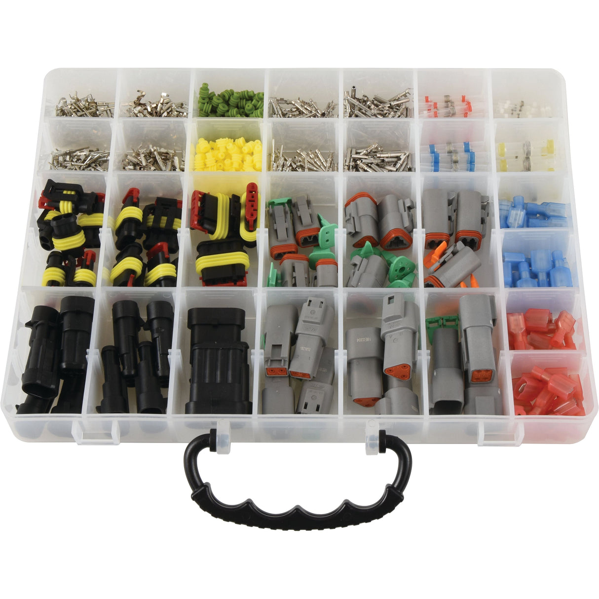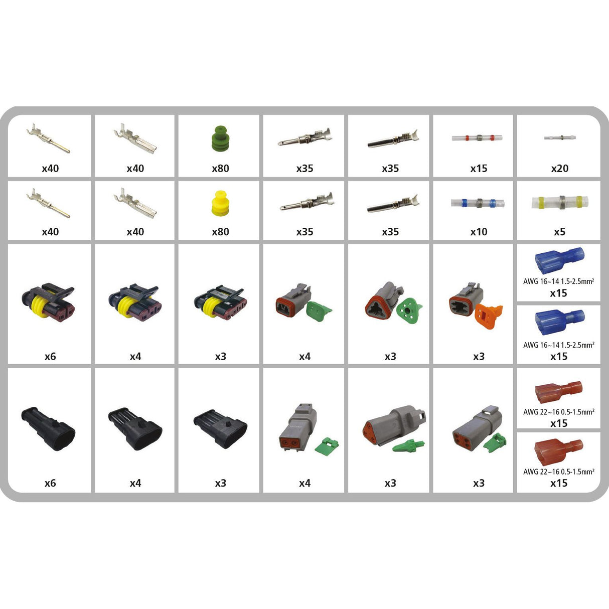 Contains: 40 x Male Terminal for (1.5) Superseal [0.3~0.5mm2] 40 x Female Terminal for (1.5) Superseal [0.3~0.5mm2] 80 x 1.0 Wire Seal for (1.5) Superseal (For Wire O.D.: 1.2~1.8mm) 40 x Male Terminal for (1.5) Superseal [0.85~1.25mm2] 40 x Female Terminal for (1.5) Superseal [0.85~1.25mm2] 80 x 1.4 Wire Seal for (1.5) Superseal (For Wire O.D.: 1.6~2.4mm) 6 x 2 Pole Male Housing for (1.5) Superseal 6 x 2 Pole Female Housing for (1.5) Superseal 4 x 3 Pole Male Housing for (1.5) Superseal 4 x 3 Pole Female Housing for (1.5) Superseal 3 x 4 Pole Male Housing for (1.5) Superseal 3 x 4 Pole Female Housing for (1.5) Superseal 35 x Stamped & Formed Pin Contact(Size 16)[AWG 18-14] (1060-16-0122) 35 x Stamped & Formed Socket Contact(Size 16)[AWG 18-14] (1062-16-0122) 35 x Stamped & Formed Pin Contact(Size 16)[AWG 20-16] (1060-16-0622) 35 x Stamped & Formed Socket Contact(Size 16)[AWG 20-16] (1062-16-0622) 4 Sets of 2 Cavity Receptacle Connector(Incl. Wedgelock) (DT04-2P & W2P) 4 sets of 2 Cavity Plug Connector(Incl. Wedgelock) (DT06-2S & W2S) 4 sets of 3 Cavity Receptacle Connector(Incl. Wedgelock) (DT04-3P & W3P) 4 sets of 3 Cavity Plug Connector(Incl. Wedgelock) (DT06-3S & W3S) 3 sets of 4 Cavity Receptacle Connector(Incl. Wedgelock) (DT04-4P & W4P) 3 sets of 4 Cavity Plug Connector(Incl. Wedgelock) (DT06-4S & W4S) 20 x Solder Sleeve Wire Splices Heat Shrink Tube [1.7 x 26mm]-White 15 x Solder Sleeve Wire Splices Heat Shrink Tube [2.7 x 40mm]-Red 10 x Solder Sleeve Wire Splices Heat Shrink Tube [4.5 x 40mm]-Blue 5 x Solder Sleeve Wire Splices Heat Shrink Tube [6.0 x 40mm]-Yellow 15 x Nylon Fully Ins. Female Disconnector[AWG16~14][1.5-2.5mm2]-Blue 15 x Nylon Fully Ins. Male Disconnector[AWG16~14][1.5-2.5mm2]-Blue 15 x Nylon Fully Ins. Female Disconnector[AWG22~16][0.5-1.5mm2]-Red