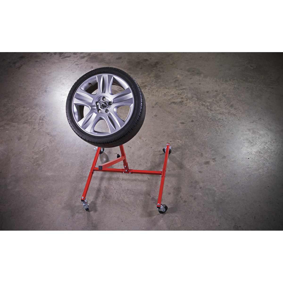 Fully adjustable supporting bars and cones for optimum height. Cone is angled for ease of use. Holds wheel up to 22". Supplied with 100mm PU wheels for moving the stand around the workshop or spray booth. Rotates the wheels on the cones so that each wheel can be painted completely.