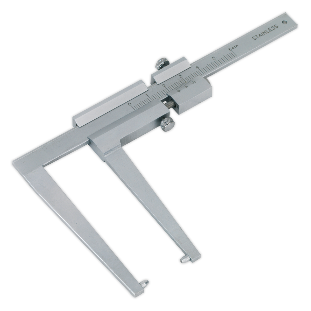 Stainless steel caliper suitable for accurate measurement of brake disc thickness. Floating jaw assembly enables easy removal of caliper from disc while retaining reading. Metric scale with 0.1mm graduations. Supplied in storage case.