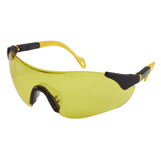 Yellow lens improves vision in low light conditions. Adjustable arms to fit all head sizes. Wraparound design offers increased protection. Soft, comfortable nose bridge. Conforms to BS EN 166/1F.