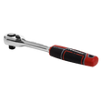 Chrome Vanadium steel 45-tooth gear-to-gear ratchet wrench, hardened and tempered, with a fully polished mirror finish. Features pear-head with flip reverse and push-button quick release. Polypropylene and TPV rubber soft, comfort grip.
