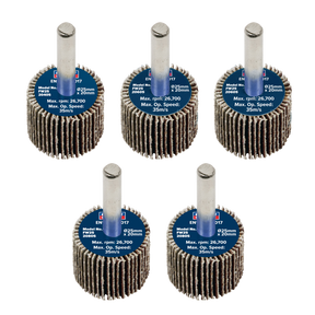 Aluminium oxide abrasive flap wheels on Ø6mm shaft. Suitable for use with power drills. Supplied in pack of 5. Ø25 x 20mm. Pack includes 40Grit (x1), 60Grit (x2) and 80Grit (x2).